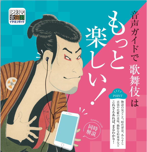 本サービスにより、シネマ歌舞伎の作品を鑑賞するお客様は、上映中にイヤホンを付けて頂くことで、物語の見どころや時代背景・あらすじ・衣裳や化粧の意味・歌舞伎独特な約束事などを解説する音声ガイドを聴くことができます。お手持ちのスマートフォンに「シネマ歌舞伎イヤホンガイド」アプリをインストールして、作品ごとの音声ガイドをダウンロードすることで、映画の進行に合わせてイヤホンからタイミングよく自動的に説明が流れます。
