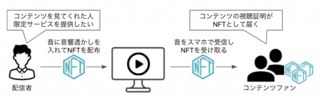 例えば、Youtuberは投稿する動画に音響透かしを入れることで、動画の視聴完了証明を取ることができます。ファン側は動画を視聴することでNFTを獲得できます。