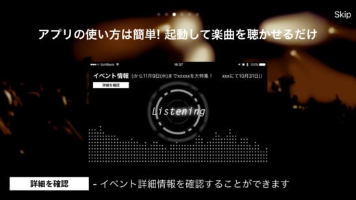 楽曲コンテンツに透かし音(暗号化したコード)を埋め込み街頭ビジョン等のスピーカーから放送し、スマートフォンやウェアラブルデバイスのマイクを通じて取得した音からアプリが透かし音(暗号化したコード)を認識、楽曲コンテンツとデバイスが同期することで、ユーザーに対してより高品質や特別バージョンの楽曲を提供し、街頭ビジョンでのユーザー体験をよりリアルなライブ感覚に演出することが可能です。