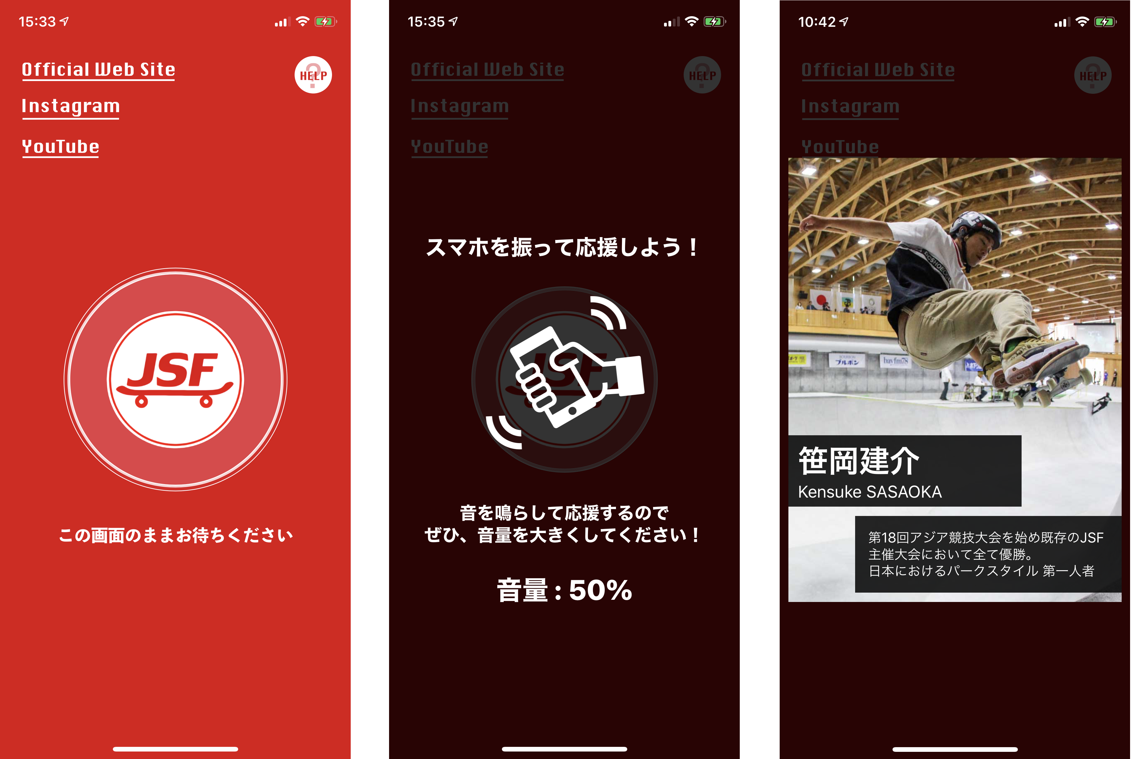 日本スケートボーディング連盟が主催するイベントや大会で、選手のパフォーマンスに合わせてスマートフォン上での演出を提供するアプリケーション。演出だけでなく、選手情報やイベント・大会情報、協賛するスポンサーによるお得な情報も提供する。