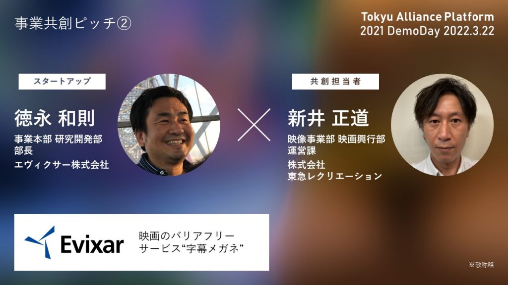 DemoDay当日は、「事業共創ピッチ(応募企業と東急グループの事業共創ピッチ)」にて、弊社と東急レクリエーションによる事業共創の取り組みについて、徳永 和則(事業本部 研究開発部 部長)より発表させていただく予定となっております。