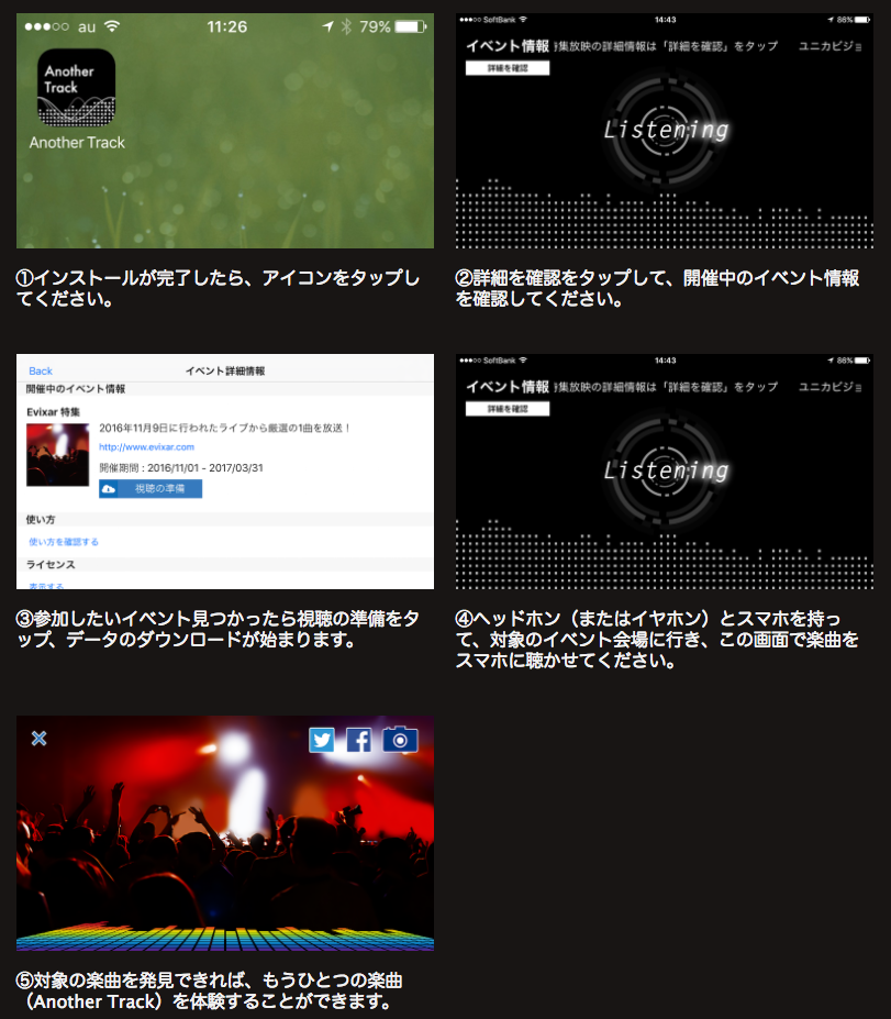 本キャンペーンでは、視聴者がスマートフォンアプリ「Another Track」を起動してユニカビジョンにかざすと、放映されるライブ映像(ミュージックビデオ)の楽曲に合わせて、スマートフォンで都会の喧騒を遮断した高品質のライブ音声を聴くことができ、よりリアルなライブ感覚を体感することができます。